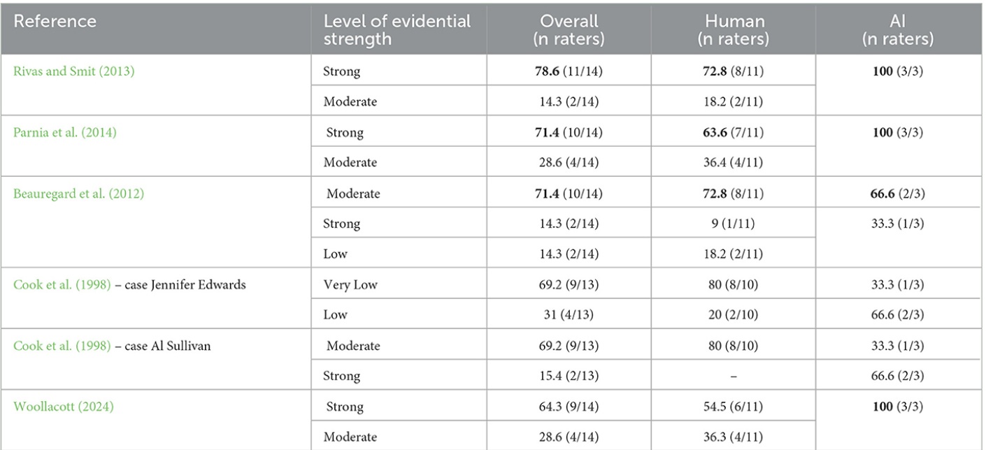 What is notable is that in the majority of cases a consensus of specific strength was not reached (e.g. strong vs moderate). However when adjacent levels were considered (e.g. strong or moderate), things improved. There was reasonable consensus within the AI models, and between AI and humans, although some wild discrepancies as well.